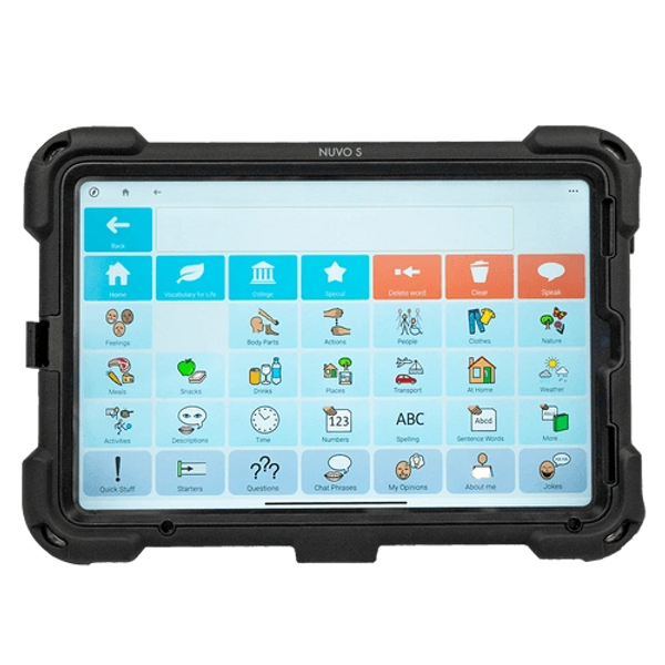 The Nuvo speech-generating device is a medical device designed for individuals with severe speech impairments, allowing them to be heard. The Nuvo device offers a variety of AAC software options, along with multiple voice choices for both adults and children. Thanks to its powerful amplified speaker system, the user's voice comes through loud and clear!